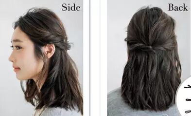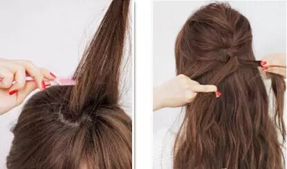 将鬓角两侧的头发留出一小部分。从两侧各取出一束头发分别向内进行扭转,在后脑中央会和。