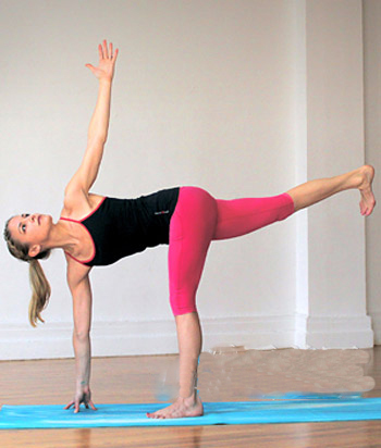 左脚与右手同时摸地,再同时抬起右脚与左手,左手往天花板延伸,眼睛盯着左手看,停留5个深呼吸后再换边