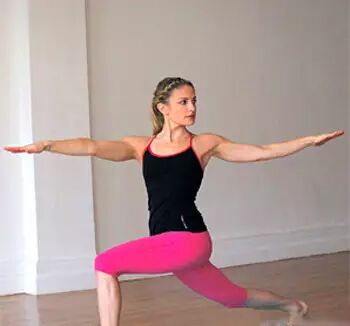 左脚向前,下半身呈现弓步,双手平举与肩同高,吸气时,往前脚的方向扭转,做10至20次后换边